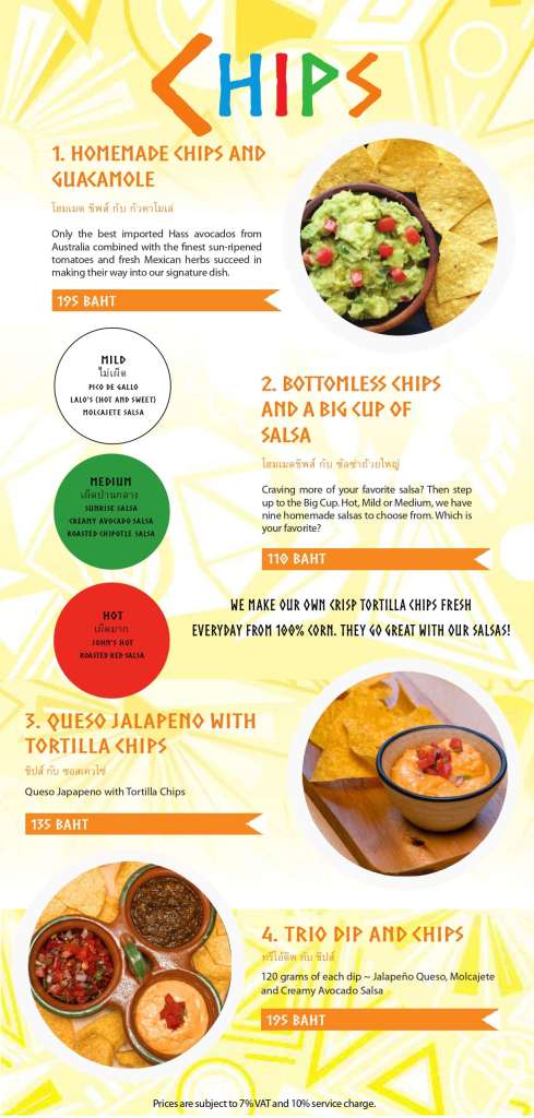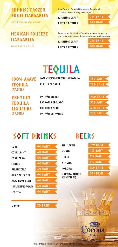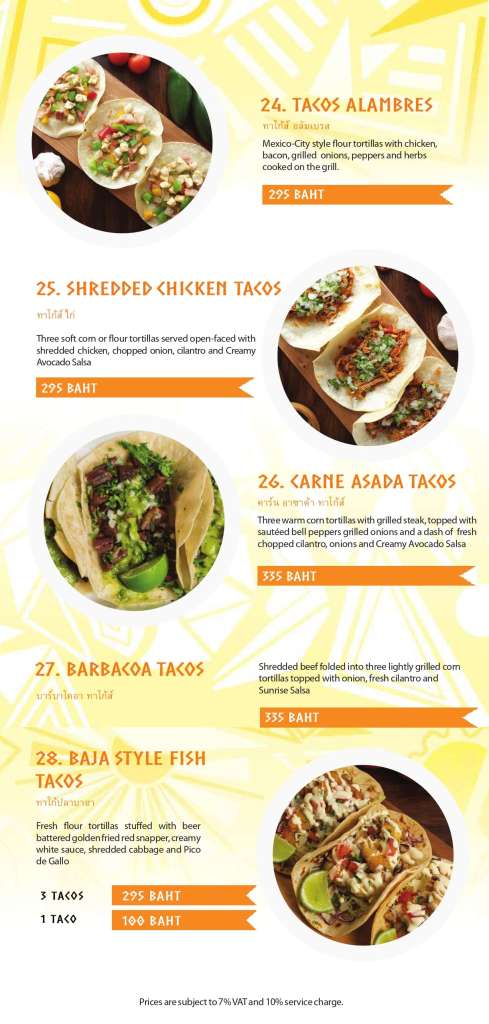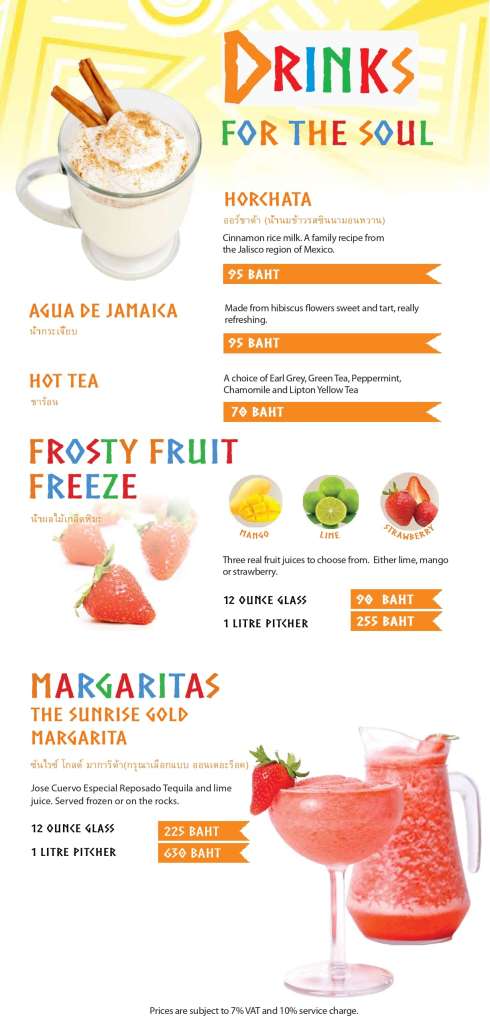 Sunrise Tacos Mexican Grill offers a fabulous array of margaritas to choose from; we use high quality tequila and triple-sec, real limes and fresh fruits in our always fresh made margaritas. Sunrise Tacos Mexican Grill never uses preservatives or pre-made mixes but fresh and tasty specialty margaritas. Come to one of our great Bangkok or Pattaya locations and have a great margarita!