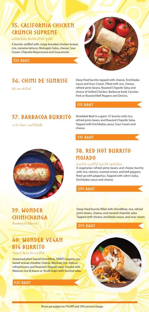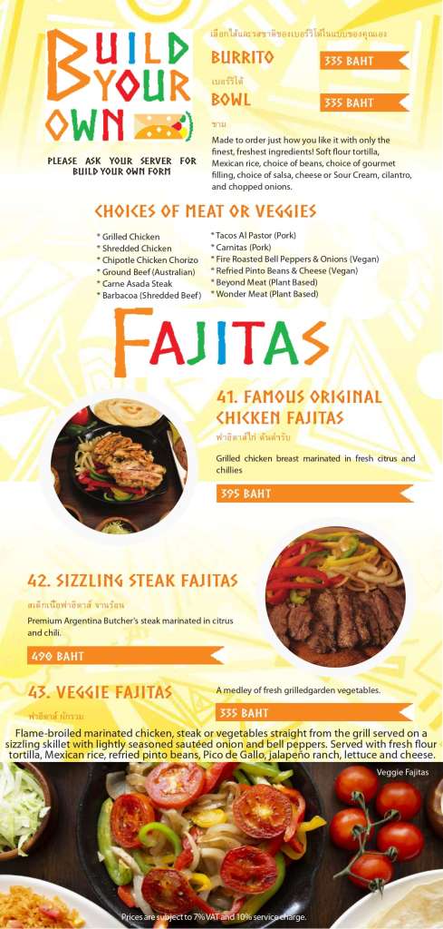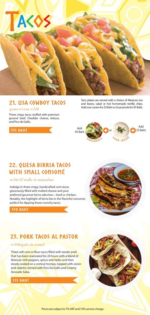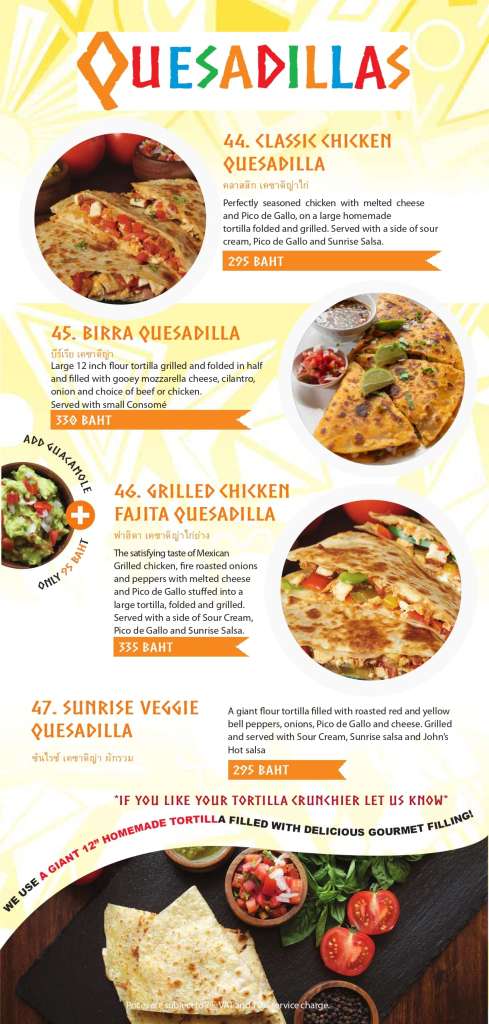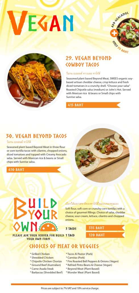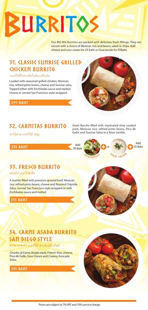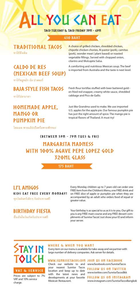 We at Sunrise Tacos Mexican Grill believe that the best and tastiest food is also nutritious and good for you. If you are hungry for delicious Mexican food in Bangkok then come to Sunrise Tacos Mexican Grill where we never put fillers in the food, we take no shortcuts and everything is 100% fresh and homemade. Sunrise Tacos uses only the best quality produce and meats. Our Sukhumvit 33/1 location is open 24 hours! Eat healthy Tex- Mex food, eat delicious tacos and burritos, and eat at Sunrise Tacos Mexican Grill!